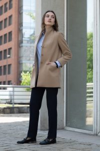 Confeccionado en paño estructurado de excelente calidad, ofrece abrigo ligero, suavidad al tacto y una caída impecable. Su solapa curva y cierre frontal con botones le entregan un estilo minimalista y moderno que combina fácilmente con distintas prendas.