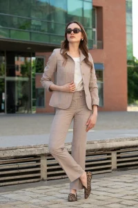 Blusa Aurora, cuello bote, de crep estampada con plumas en tonos avellana, manga 3/4